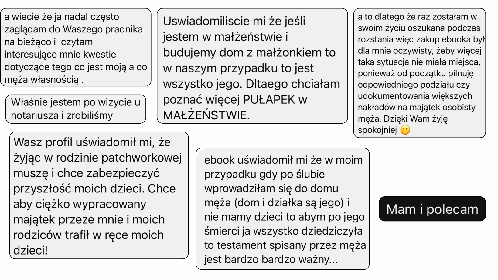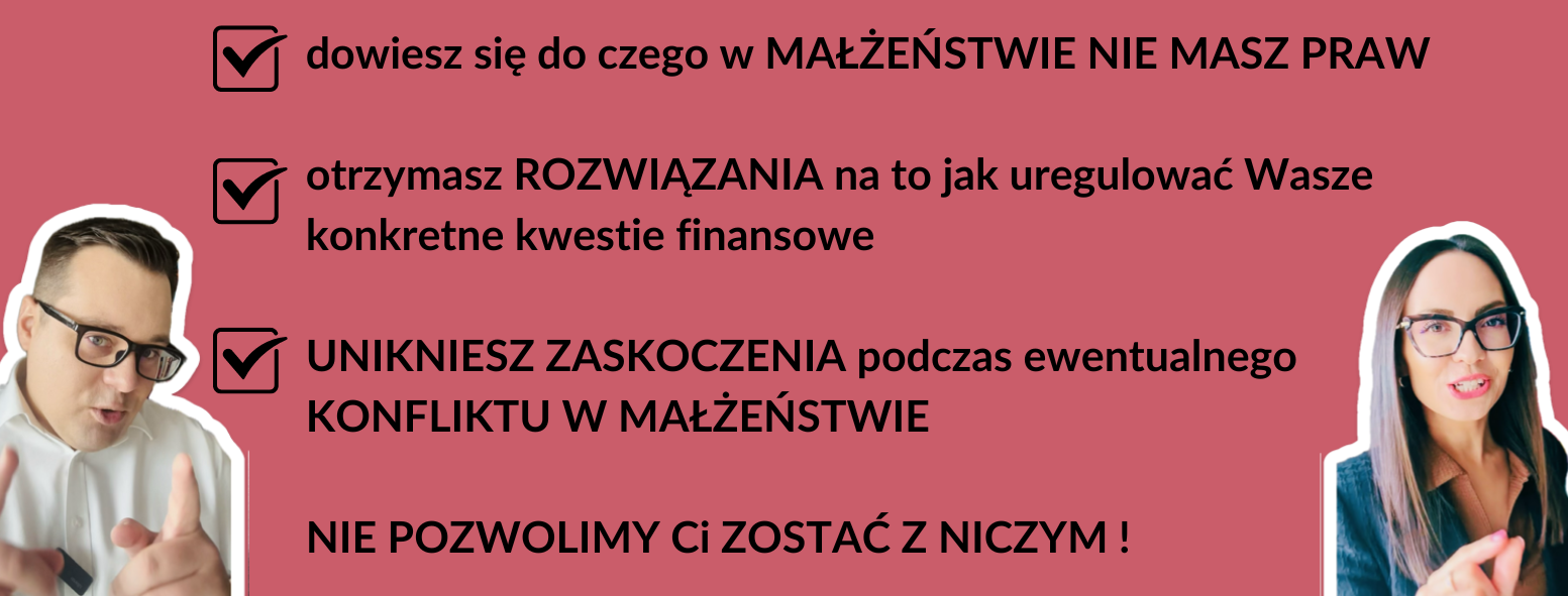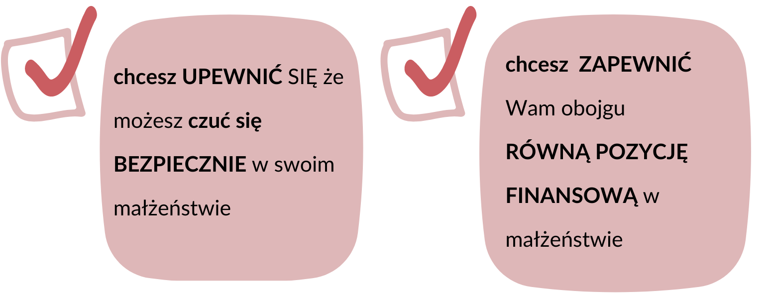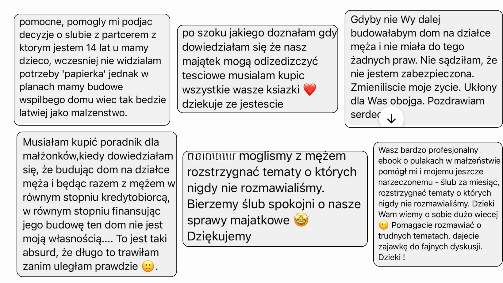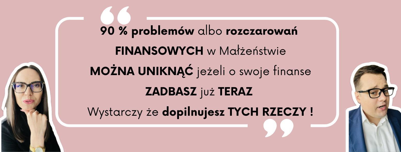 Dzięki tysiącom wiadomości, które otrzymaliśmy od Was, opracowaliśmy najbardziej powtarzające się problemy finansowe i majątkowe w małżeństwie i wskazaliśmy ich rozwiązania, abyś TY czuła/ł się bezpiecznie w małżeństwie !!