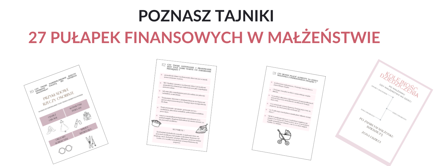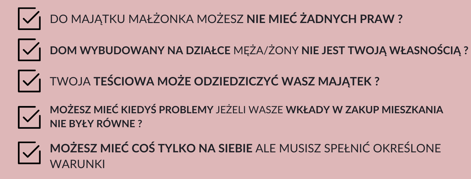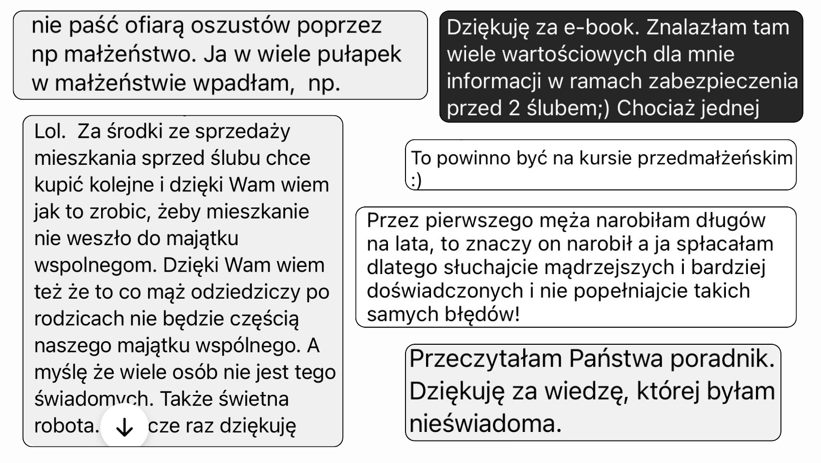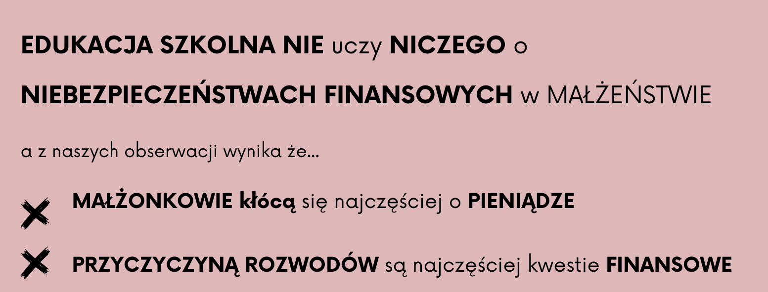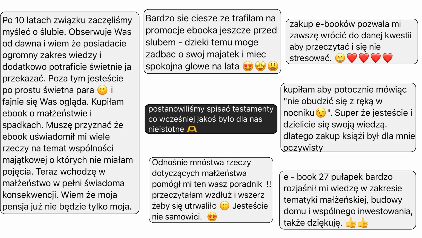 Dzięki tysiącom wiadomości, które otrzymaliśmy od Was, opracowaliśmy najbardziej powtarzające się problemy finansowe i majątkowe w małżeństwie i wskazaliśmy ich rozwiązania, abyś TY czuła/ł się bezpiecznie w małżeństwie !!